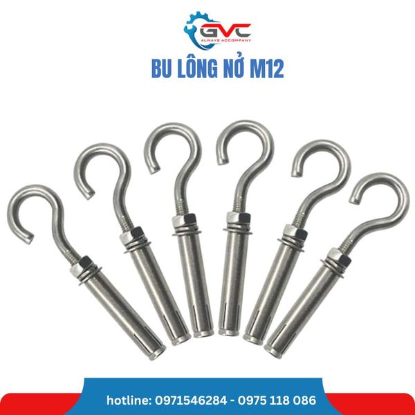Bu lông nở móc M12: Có đầu móc hoặc chữ J, L, dùng để treo vật dụng.