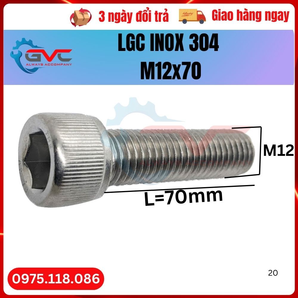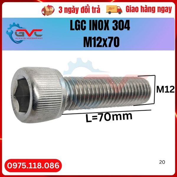 Bu long lục giác chìm đầu trụ DIN 912 inox 304 M12x70 thuộc danh mục hơn 1000 chủng loại bu lông ốc vít của công ty GVC, Là linh kiện cơ khí được sử dụng trong nhà máy gia công chế tạo, khuôn mẫu, máy móc tự động hóa, các thiết bị dùng trong ngành thực phẩm, dược phẩm, môi trường axit, muối biển, làm việc ngoài trời sẽ sử dụng bu lông lục giác chìm đầu trụ mang chất liệu phù hợp...Để ghép nối các chi tiết với nhau, với độ cấp bền tiêu chuẩn cao, Tổng kho bu lông ốc vít sẵn kho từ M3 đến M36. Bulong ren hệ mét, Bu lông lục giác chìm đầu trụ inox 304 M12x70 giá cả hợp lý nhất trên thị trường
