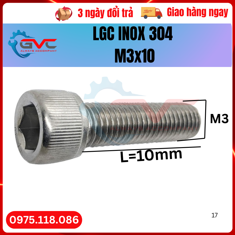 Bu long lục giác chìm đầu trụ DIN 912 inox 304 M3x10 thuộc danh mục hơn 1000 chủng loại bu lông ốc vít của công ty GVC, Là linh kiện cơ khí được sử dụng trong nhà máy gia công chế tạo, khuôn mẫu, máy móc tự động hóa, các thiết bị dùng trong ngành thực phẩm, dược phẩm, môi trường axit, muối biển, làm việc ngoài trời sẽ sử dụng bu lông lục giác chìm đầu trụ mang chất liệu phù hợp...Để ghép nối các chi tiết với nhau, với độ cấp bền tiêu chuẩn cao, Tổng kho bu lông ốc vít sẵn kho từ M3 đến M36. Bulong ren hệ mét, Bu lông lục giác chìm đầu trụ inox 304 M3x10 giá cả hợp lý nhất trên thị trường